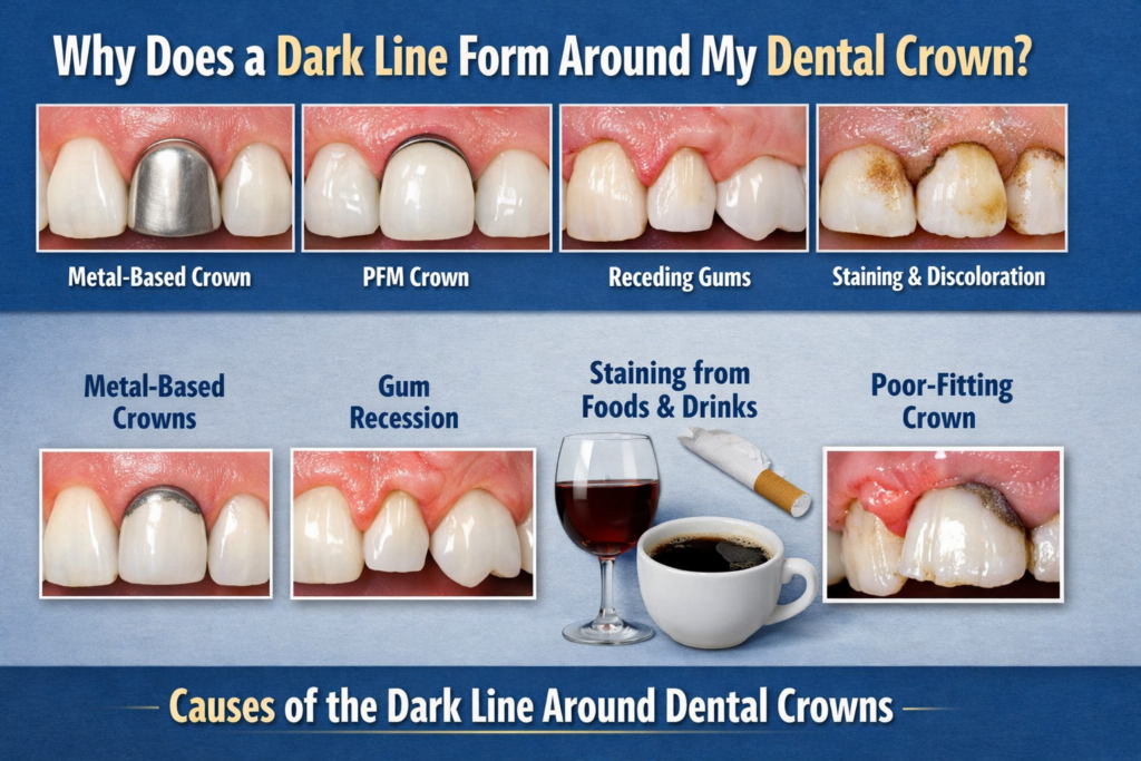 A dark line around your crown is usually caused by metal-based crowns, gum recession, or staining. It’s often due to the metal showing through at the edge or the natural wear of the crown over time.